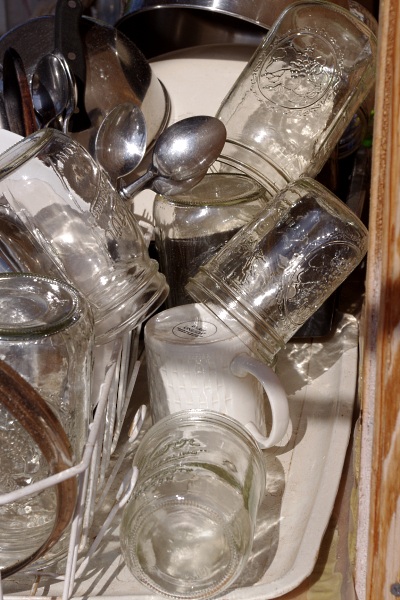 And those jars there – they are my daily dance partner, all two dozen of them. They once came filled with milk or perhaps they made the morning coffee or acted as someone’s water glass for the day. At the end of the day (snort, three days is more like it) they all get washed. From counter to sink to hand to dishrag and back to counter again. If I could just find a place for all of these jars it would be a beautiful thing we’ve got going on.