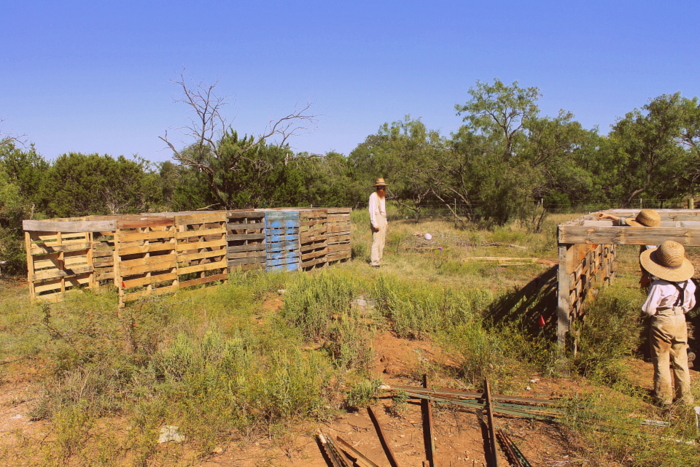 This week he’s working with a backhoe to create swales and ponds, root cellars and outhouses. Can anyone guess what else he’s got up his sleeve from the above pallet-laden photos?